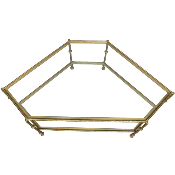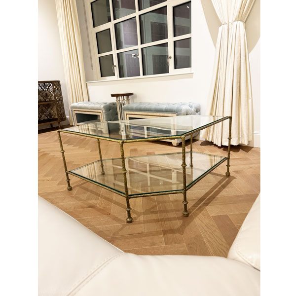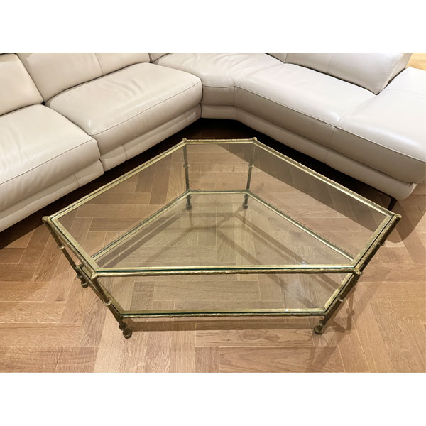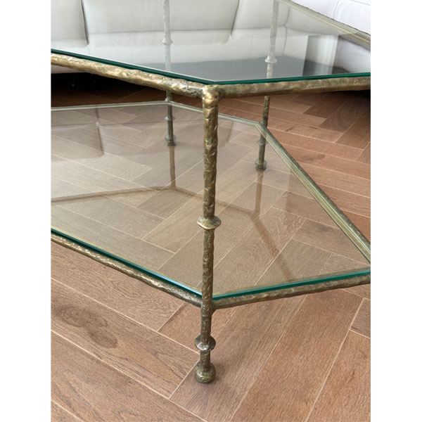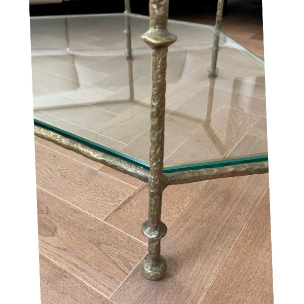 Diego Triangular Coffee Table was designed for use in high end residential and hospitality interiors. Robust bronze construction ensures strength and stability even with a heavy glass top and shelf in place. The surface of the bronze is beautifully textured as though it was sculpted by an artist. It is made by a casting process. Molten bronze is poured into a mold that can be used only once. The rough casting is then painstakingly smoothed by a master craftsman. This is a long and laborious process requiring great attention to detail so as not to destroy the texture. Such organic surface texture was widely used by Diego Giacometti (1902 – 1985) on his furniture and lighting creations. As a tribute to this gifted artist this coffee table is named for him. The bronze is available either polished or in a variety of hand-applied patinas. Diego Triangular Coffee Table was designed by Shah Gilani, ISFD. Custom sizing is available.