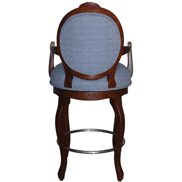 The Louis XV Bar Chair was designed for upscale homes, pubs, restaurants, cafes, wine cellars, and bars. With its classic styling, it makes an exceptional bar chair for the game room, man cave, or home bar, especially when used with one of our bar tables or free standing bars. Hand-made of rosewood, this bar chair is also available as a counter chair. The bar chair has a seat height of 30 inches while the counter chair seat height is only 24 inches. We do not buy ready-made chair frames like most manufacturers do. Each chair is individually hand-crafted from carefully selected raw lumber. Each chair frame is put together by a skilled craftsman. All carving is done entirely by hand. The solid brass footrest adds that special accent. The seat has a memory swivel that brings it back to face-forward position after use. The seat cushion has 8-way hand-tied springs which will not sag even after decades of use. Standard upholstery material is cream, black, or brown calf leather. Upholstery in COM or COL is available. The Louis XV Bar Chair wood frame is available in a variety of finishes. Robust construction of this hand-made chair makes it eminently suitable for high-end residential or commercial interiors. Designed by Shah Gilani, ISFD. Custom sizing is available.
